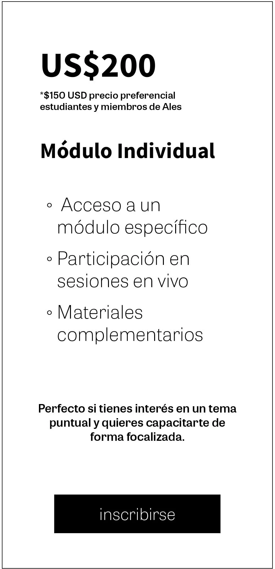Puedes pagar con tarjeta de crédito, transferencia o medios electrónicos disponibles en tu país. También ofrecemos tarifas especiales para estudiantes, miembros ALES y grupos.